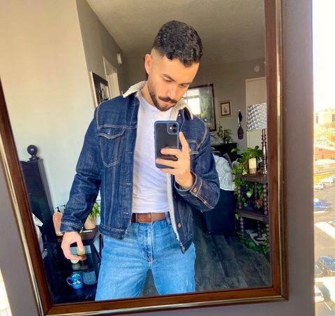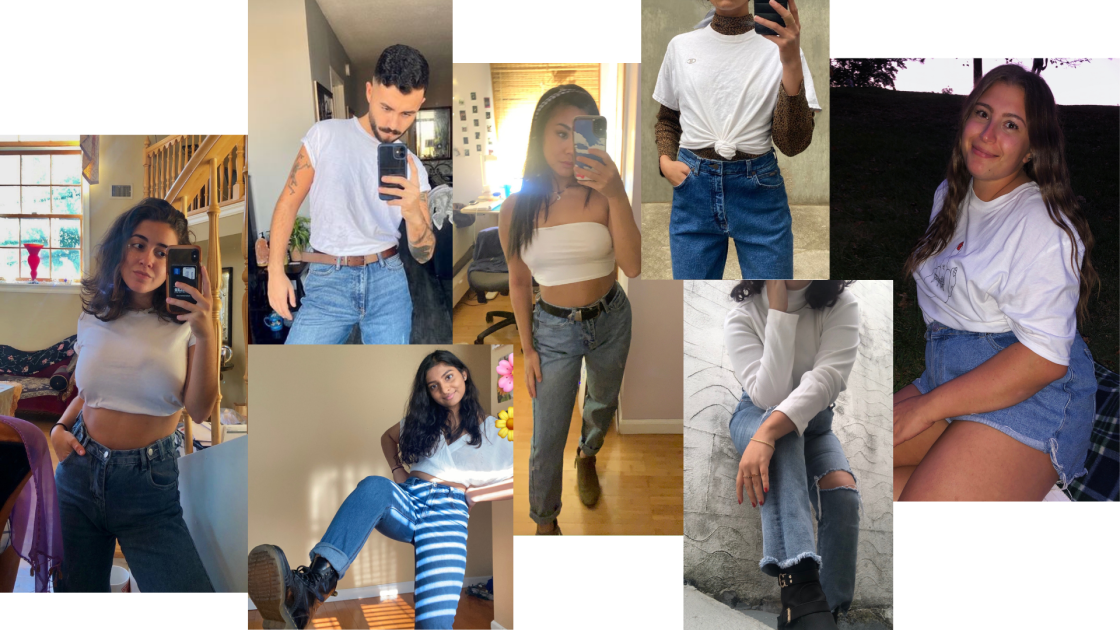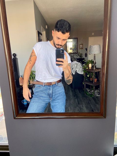 Naturally, I wanted to know what my friends thought so I challenged them to come up with their best white-t-shirt-and-jeans outfit that allows their personality and style to shine through. I gave them a purposefully vague prompt: “Dress yourself in your best white-t-shirt-and-jeans fit, snap a mirror selfie, and explain your stylistic choices.” Here are the results.
