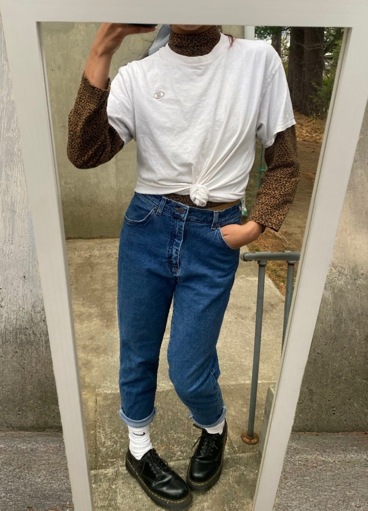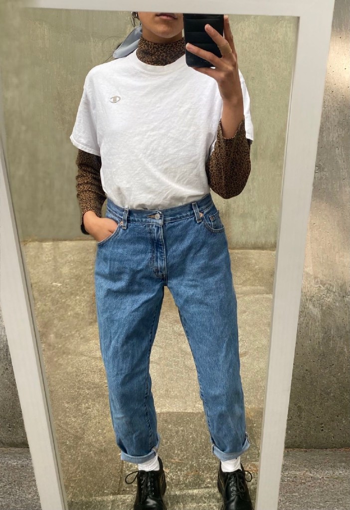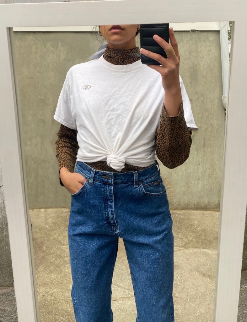 I styled this white champion tee with thrifted Wrangler jeans and a thrifted leopard print turtle neck. Prints and patterns can be intimidating but there is nothing you can’t throw a white tee over (or under)! The more layers the better! I love prints and I think they’re such a fun way to express your personality on the outside. I loveee thrifting and there are so many crazy pieces. Since they’re not nearly as expensive as something new would be, I just started buying them because I didn’t feel as much pressure to wear them. Even if I could get one unique fit out of the piece it was worth it. But as my wardrobe starting filling with more fun pieces I started noticing how beautifully textures and patterns and prints can complement each other. So slowly, I started incorporating prints into my every day wear until it has become more easy and casual to mix and match.