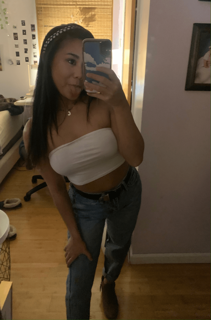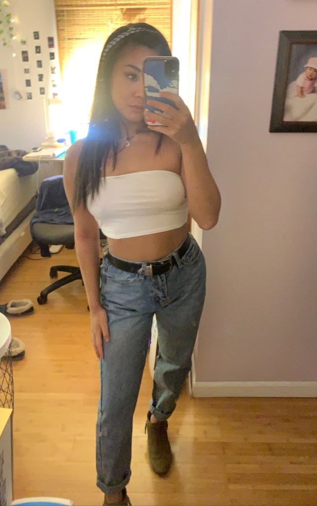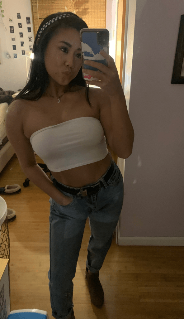 I would wear this in the summer or spring time to plans with pals –– for example, to diddle daddle in the city. I usually wanna be comfy so I wear loose jeans because I like how they fit my body, but also I don’t like stressing over my fit, so a simple tube top never misses for me. I also got on a headband bc I got into head accessories this year and that was low key the closest one I could find and it matches my belt. And I like subtle booties like my one-inch ones that are comfy but give me that small boost.